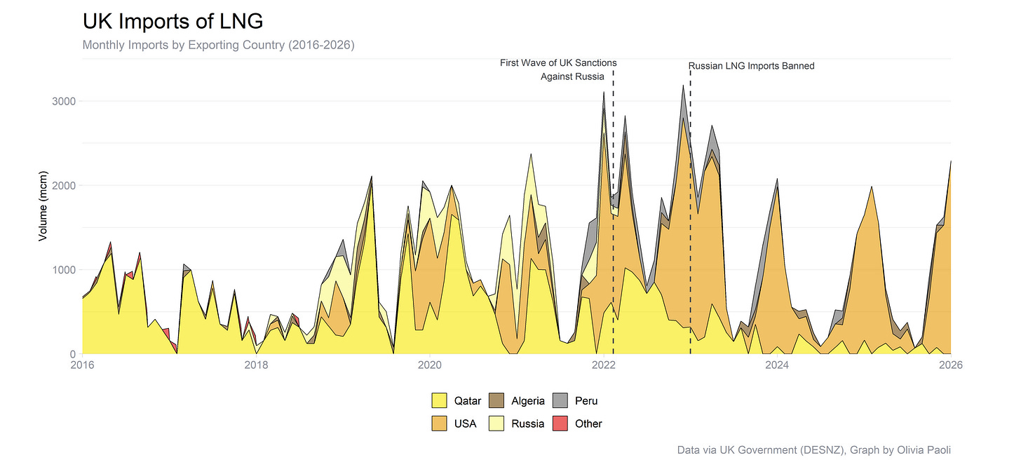 Exchange student Olivia Paoli shared some really neat data I had not seen before on UK LNG imports and graphed it to show the impact of sanctions against Russia. One of my favourite parts of this class is that it attracts students from all over the world who are interested in energy policy.