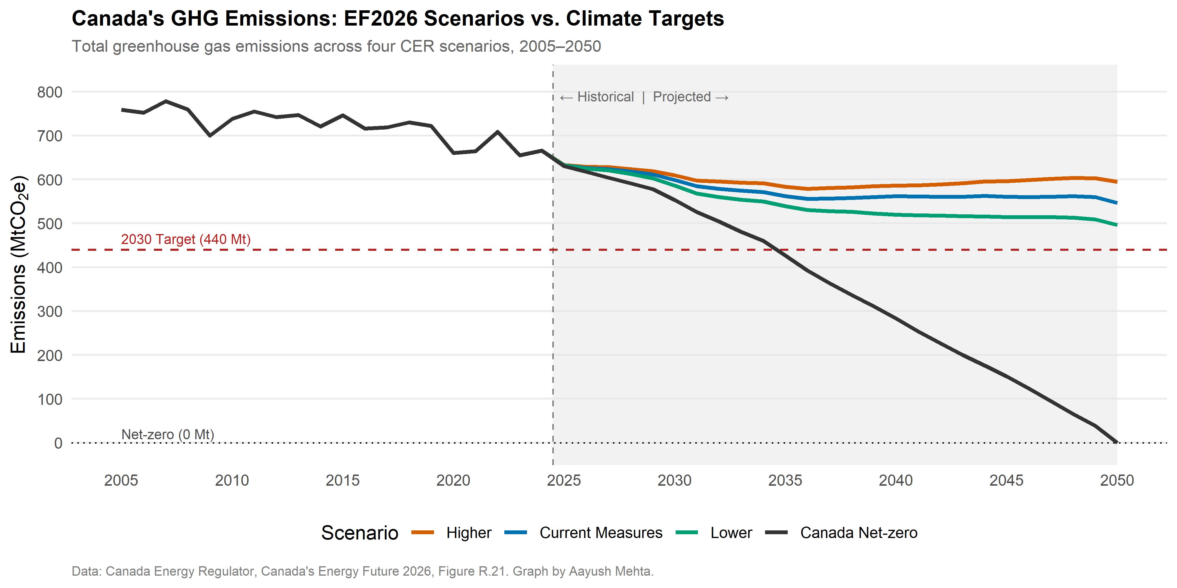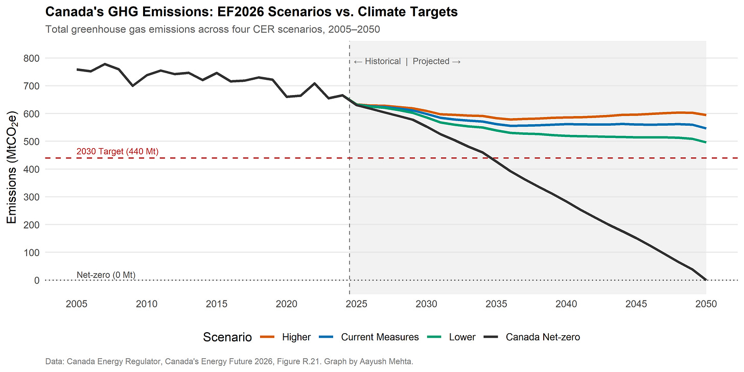 This graph, from Aayush Mehta is a nice visualization of historic emissions, targets, and projections from the Canada Energy Regulator. It also really shows how much more stringent Canada’s policies are likely to have to be to meet our net-zero goals by 2050.