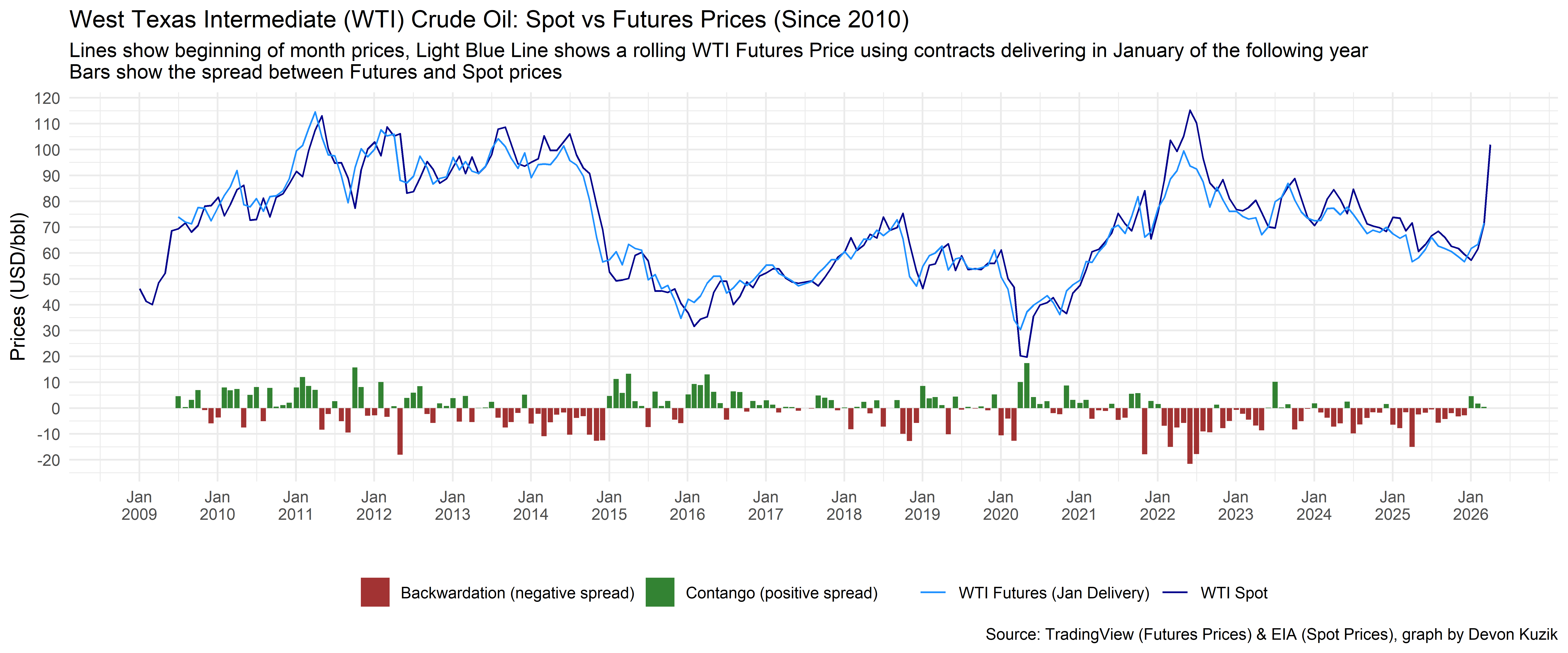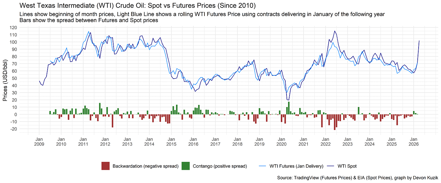 Finance student Devon Kuzik, from whom I learned more than a few things this term, has a great visual of WTI spot vs. futures prices which includes my two favourite words in energy finance: contango and backwardation.