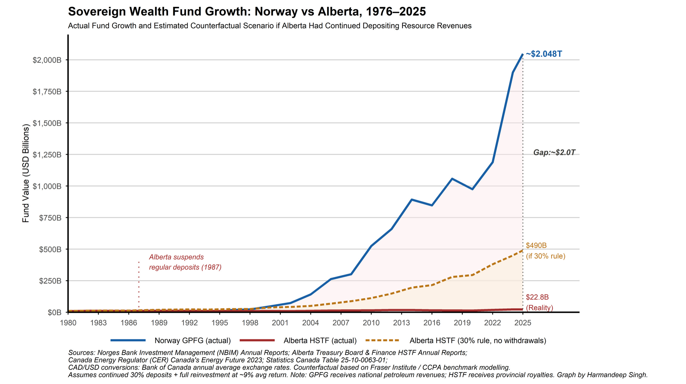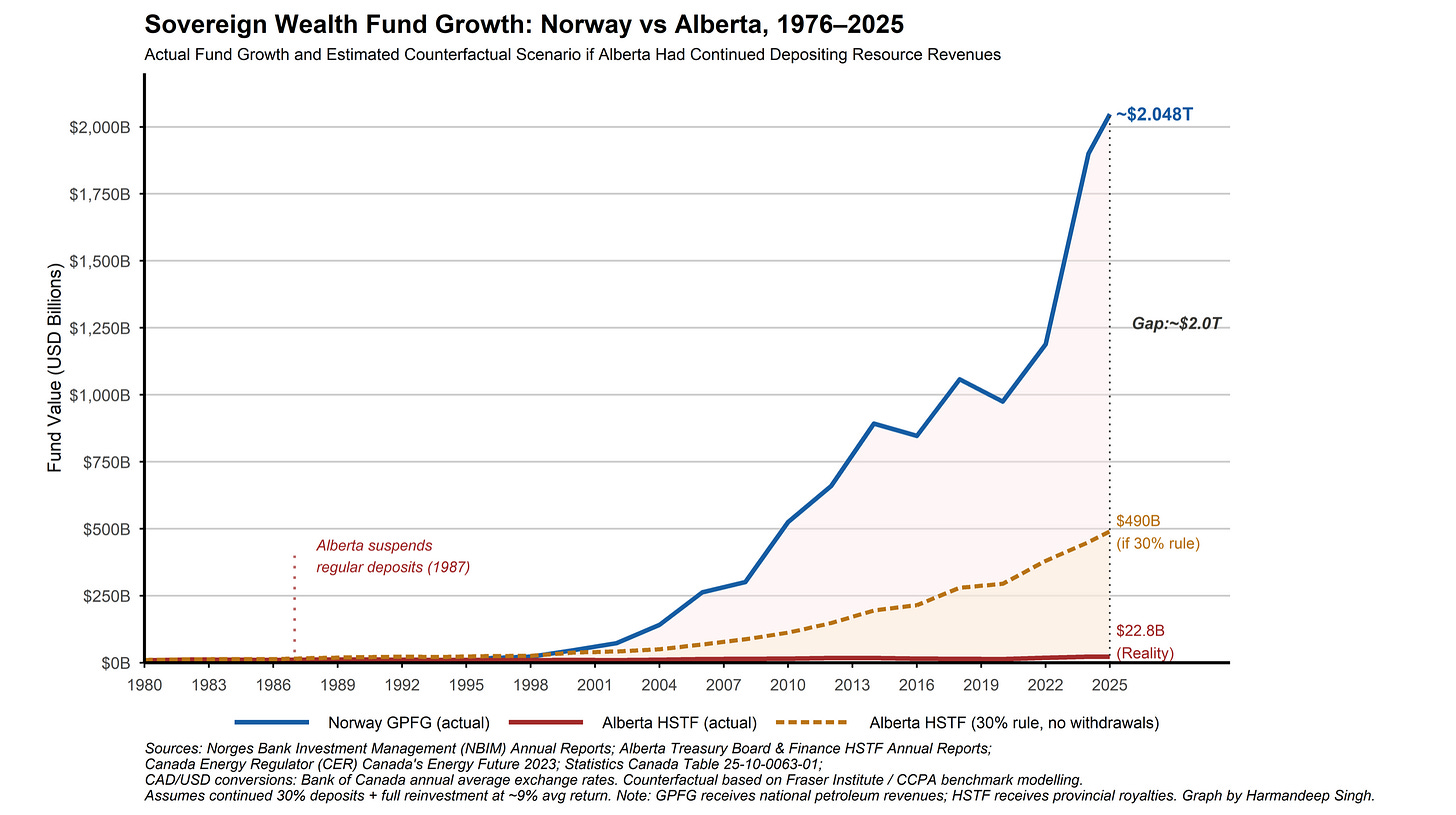 This year’s award for inadvertently (?) trolling your professor goes to Harmandeep Singh for this graph of growth in Norway’s sovereign wealth fund compared to Alberta’s Heritage Fund. There was no Norwailing warning on the assignment!