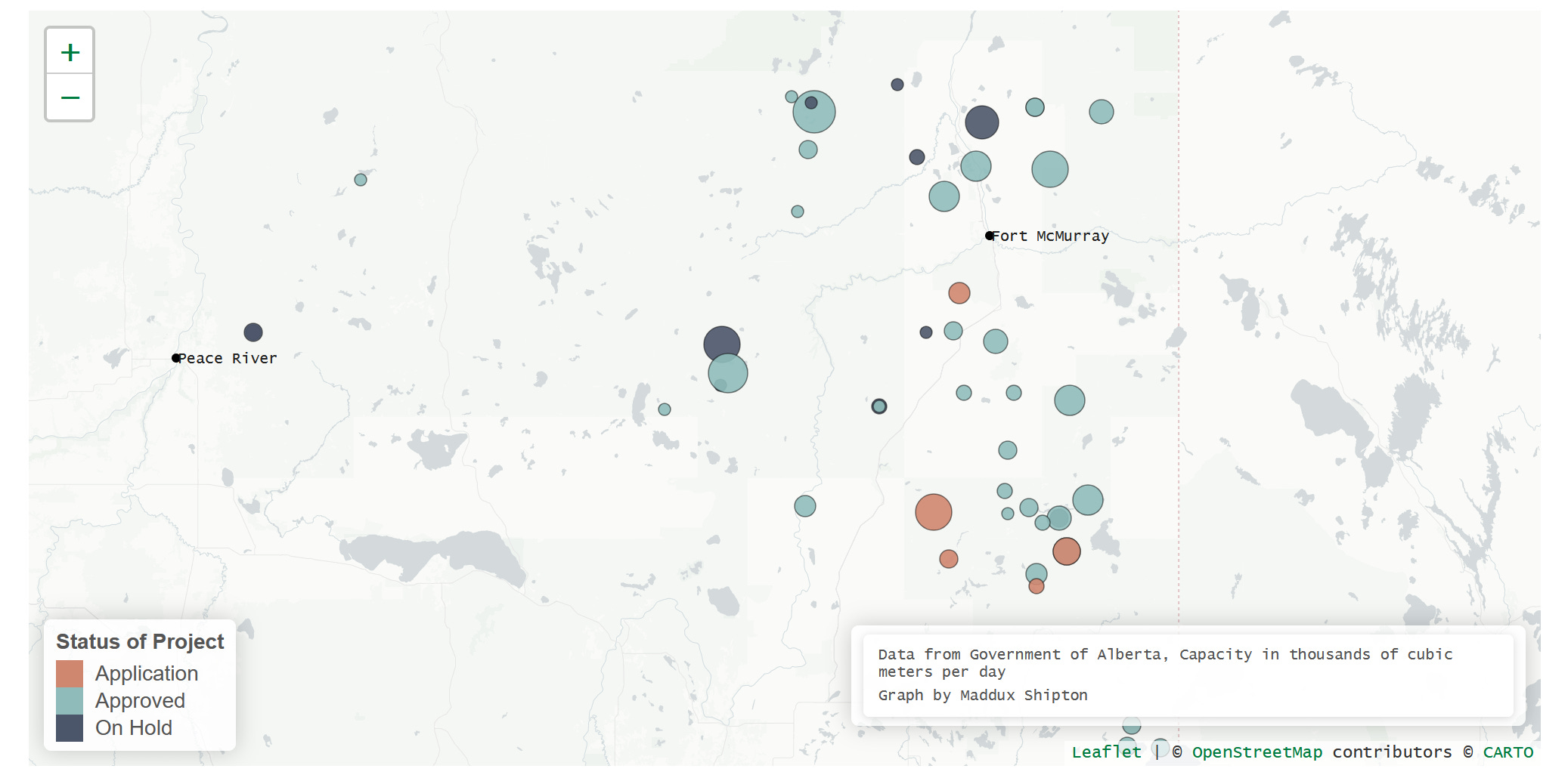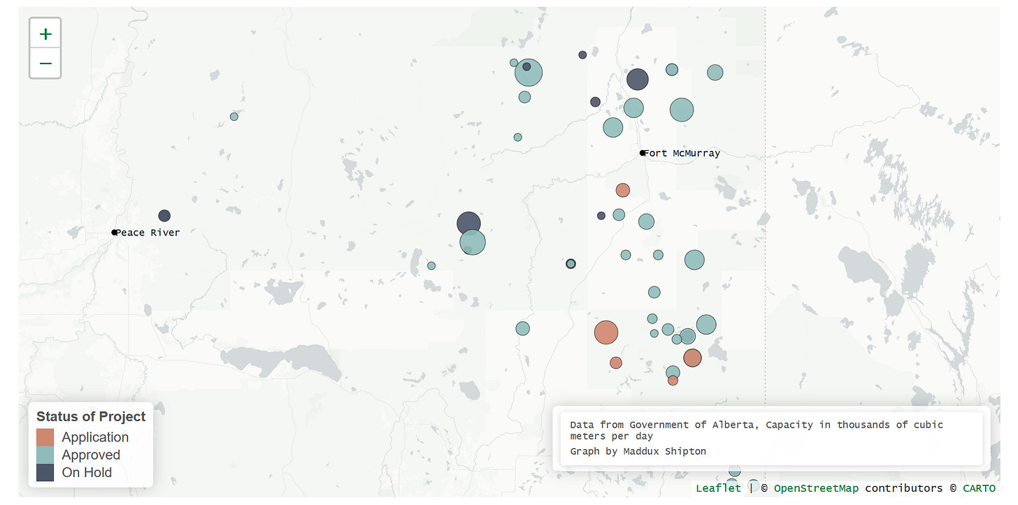Maddux Shipton took on mapping all of the potential oil sands projects in Alberta, including those approved, on-hold, or in the application phase. If you read Maddux’s write-up, you will see why this map might soon be on a wall near Premier Smith’s offices at the Legislature.