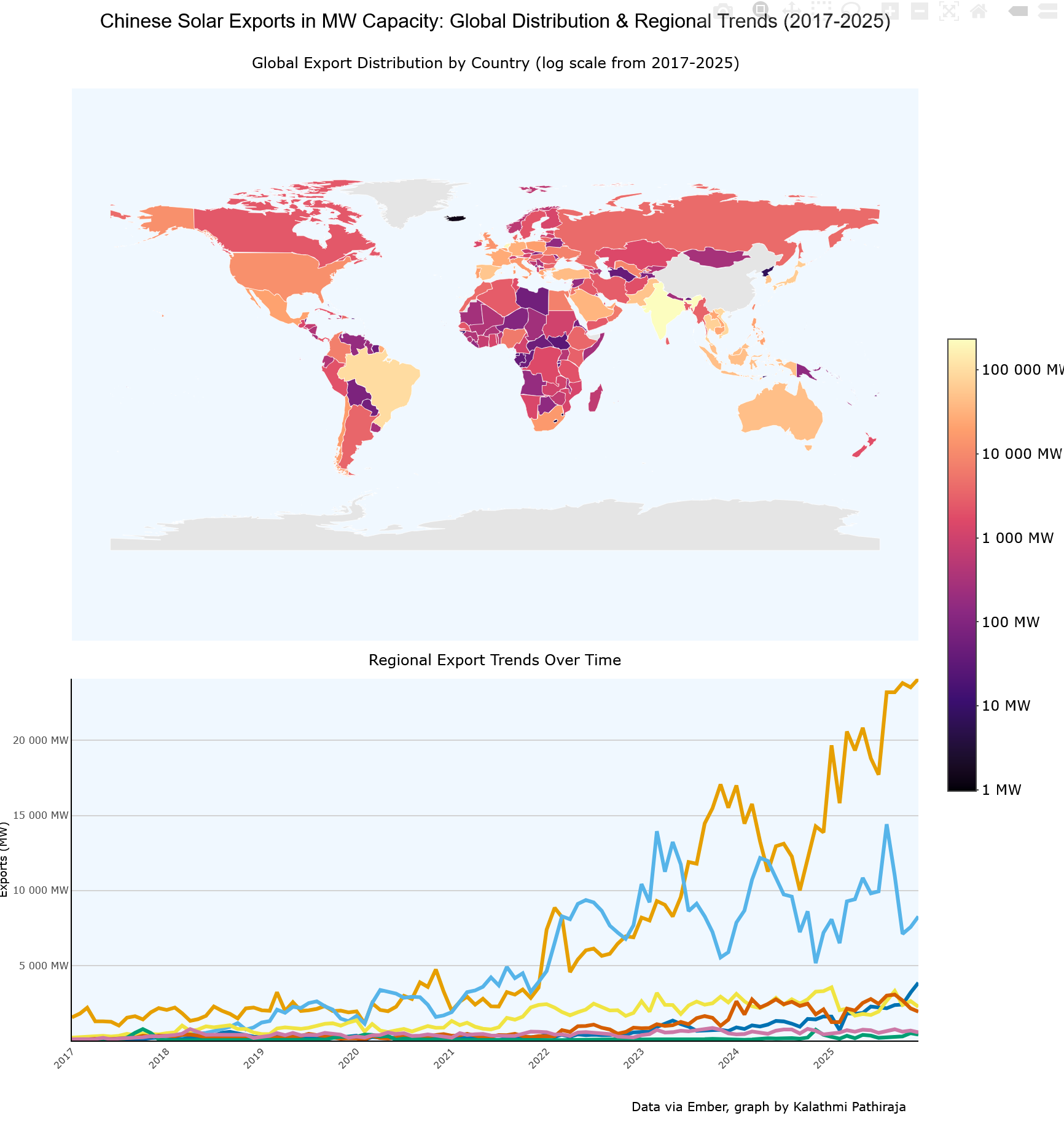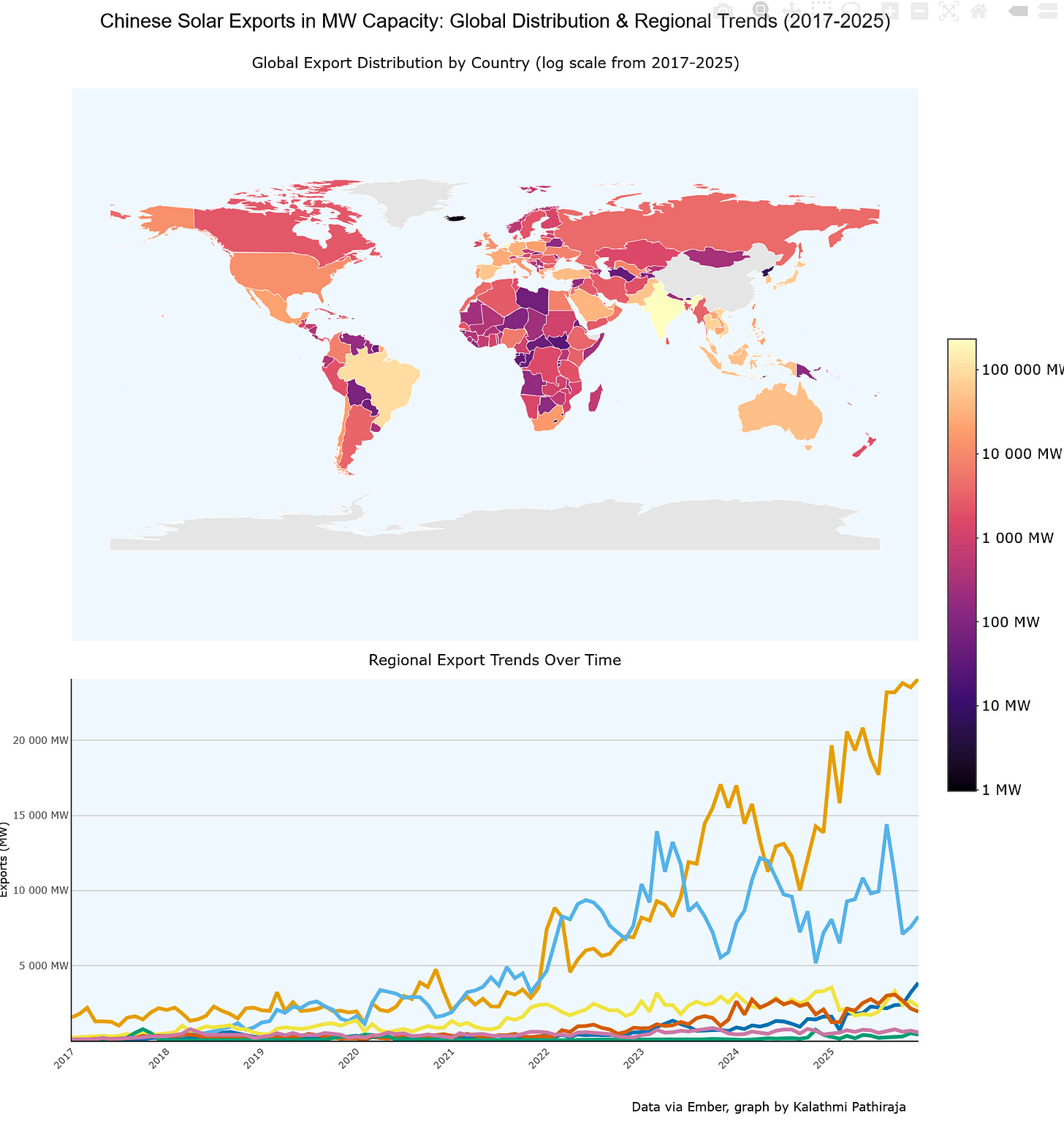 The graph above you really need to see on the live html site, since Kalathmi Pathiraja has built-in mouse-over info for data showing how Chinese solar panel exports have been distributed across the world.