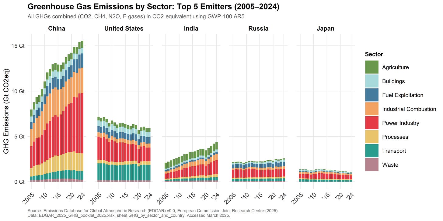 And, Caitlyn Hajjar put together a really nice visualization of sector-level emissions from world’s five largest sources of greenhouse gases. The side-by-side comparison of China and the US is really quite striking!