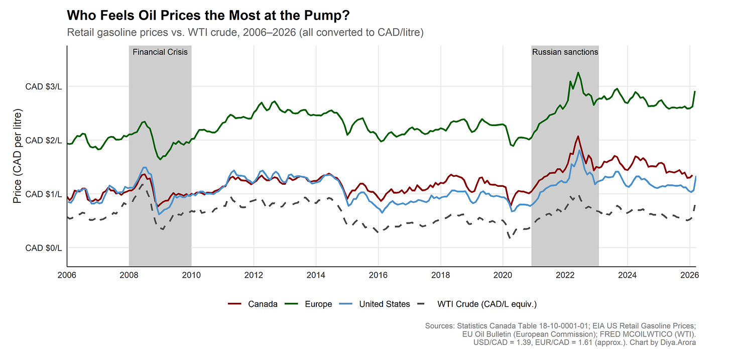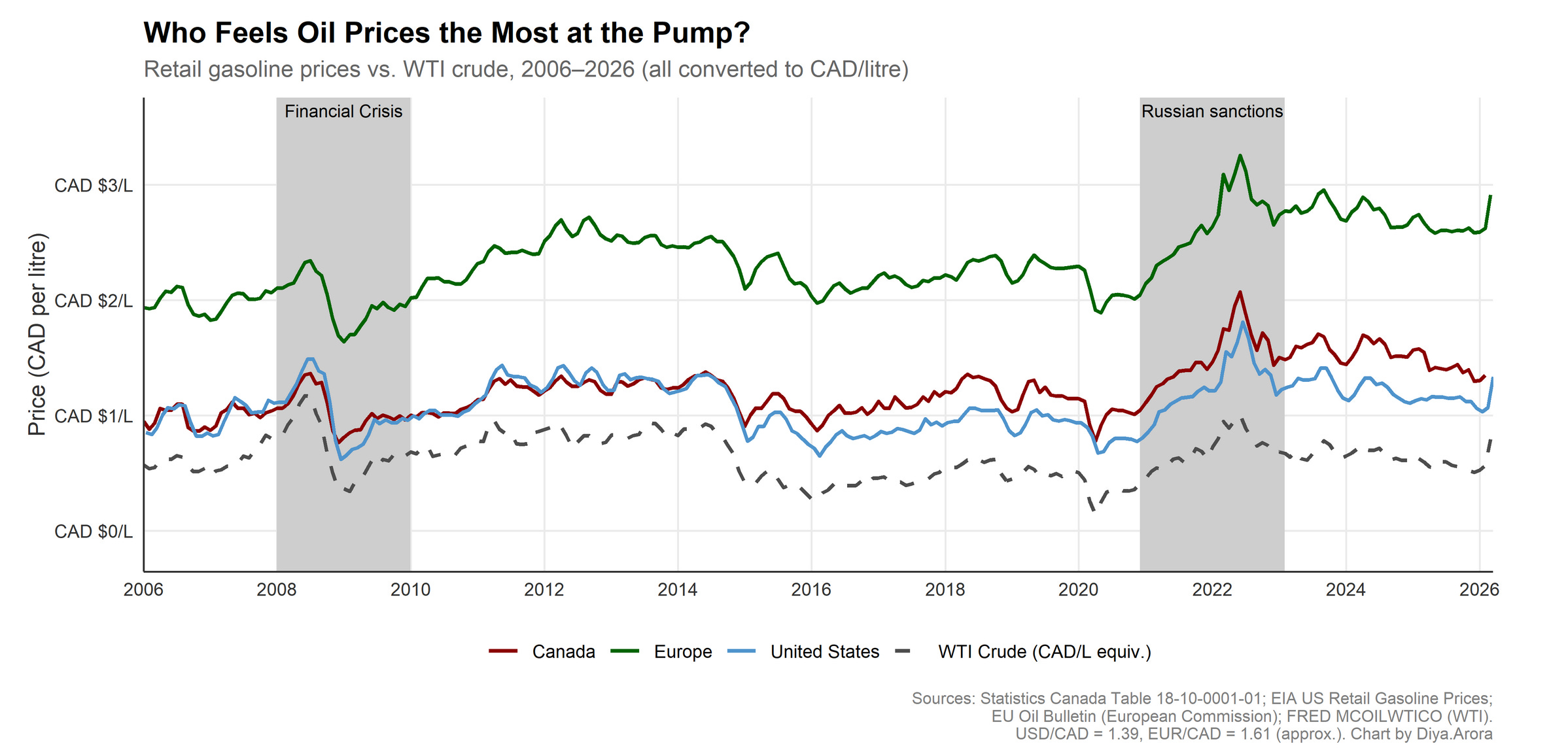 First, I really like this chart from Diya Arora, a graduating Honours student in economics who is off to grad school at UBC in the Fall. Diya’s chart is timely, clean, and really captures the role of global economic conditions, crude prices, and local markets and taxes in setting gasoline prices in Europe and North America.